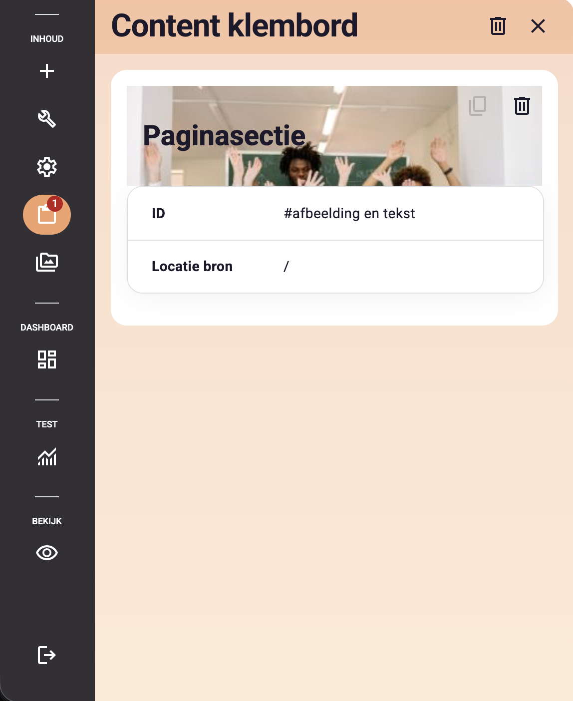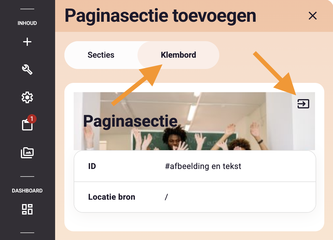 Het onderste icoon van het menu van de editor is het klembord. Op het klembord staan secties, rijen en elementen opgeslagen die 'geplakt' kunnen worden op een pagina. Deze functie kan je gebruiken als je een sectie of element hebt aangemaakt en gevuld op de ene pagina, en die ook op een andere pagina wilt gebruiken. Of als je bijv. een sectie toch op een andere pagina wilt zetten.