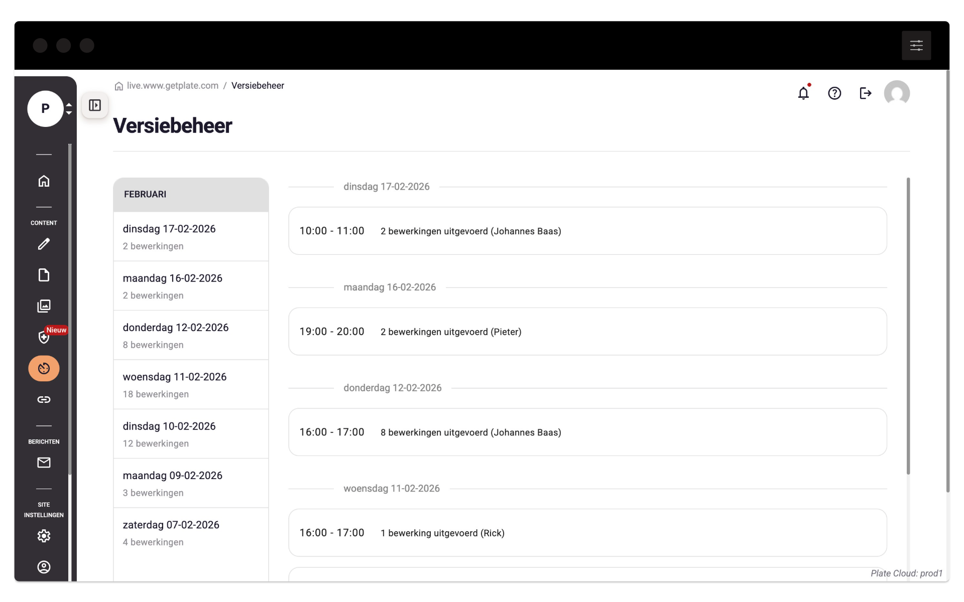 - Je klikt in je dashboard op Versiebeheer en zoekt daar het moment op waar je je website naar terug wilt rollen. Je ziet hier ook welke wijzigingen door welke beheerders zijn uitgevoerd en op welk moment.