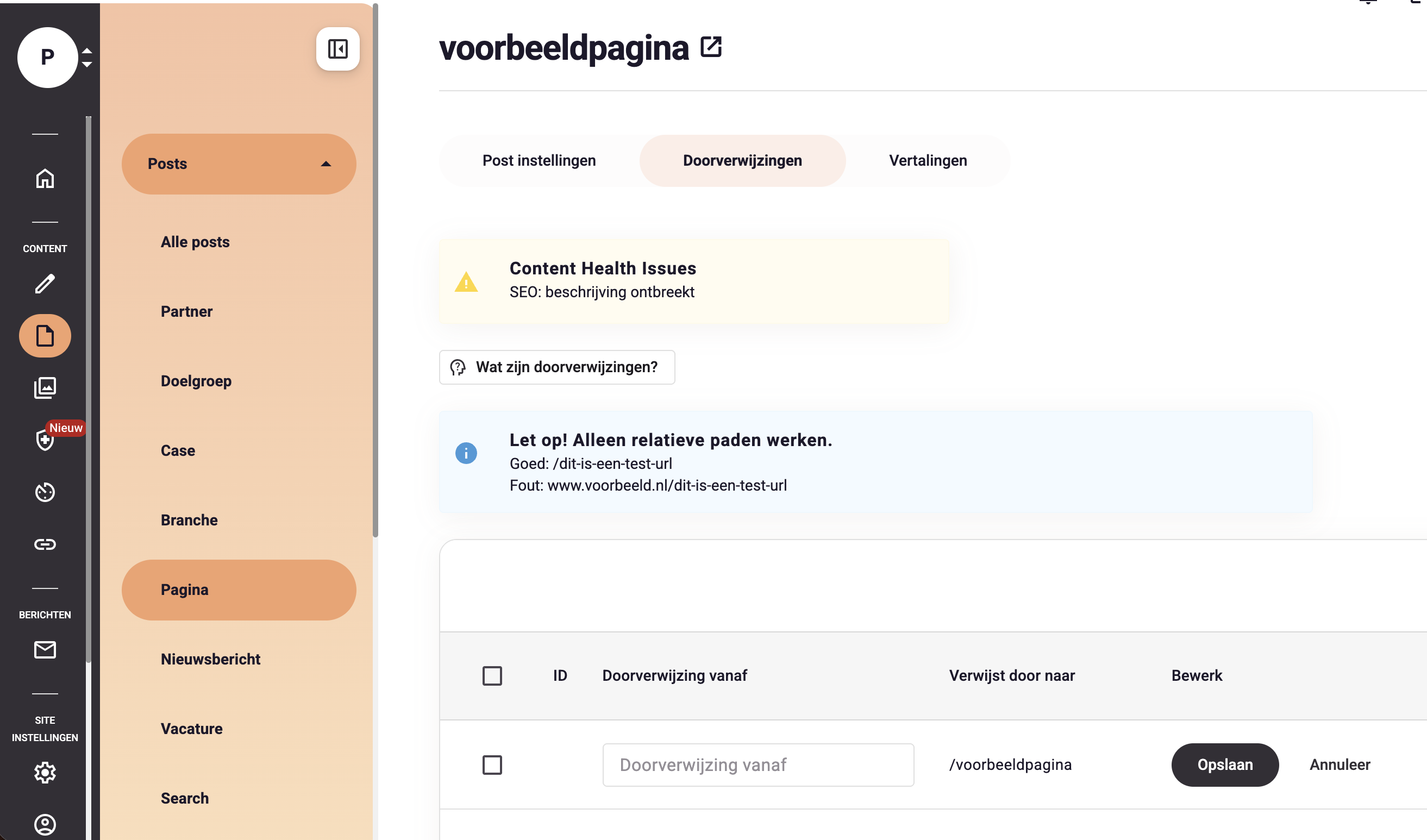 - Er kan geen redirect ingesteld worden met een Bron URL / 'doorverwijzing vanaf' die in gebruik is voor een pagina. Dus als de slug in gebruik is binnen het CMS, dan zal die URL altijd naar de bestaande pagina worden gestuurd. Wil je de slug wel door laten verwijzen? Verwijder dan de pagina die deze slug gebruikt of wijzig de slug van die pagina.